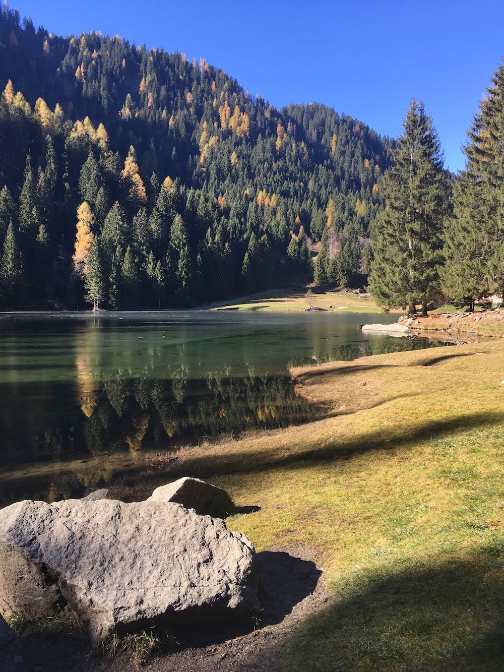 Erano i primi di novembre, le poche latifoglie attorno al lago avevano già perso tutte le foglie, mentre i larici erano in pieno “foliage”, bellissimi punti di colore acceso tra il bosco di abeti.