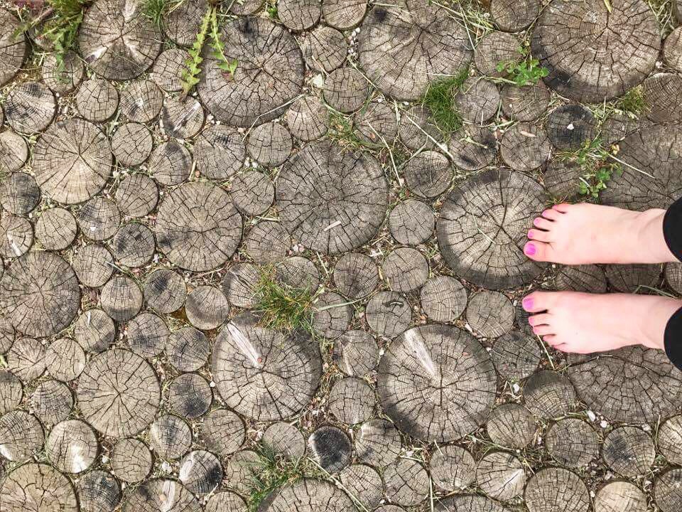 Il percorso si fa rigorosamente a piedi nudi (le scarpe si possono lasciare in un piccolo casottino all’entrata del parco) camminando prima in acqua fredda, poi su pezzi di corteccia, tronchi, ciottoli, in un laghetto con fondo argilloso e poi ancora immergendo viso e braccia nell’acqua. L’azione dell’acqua fredda è incredibilmente rigenerante, aiuta a migliorare la circolazione e vi farà sentire gambe e piedi leggeri come non mai.