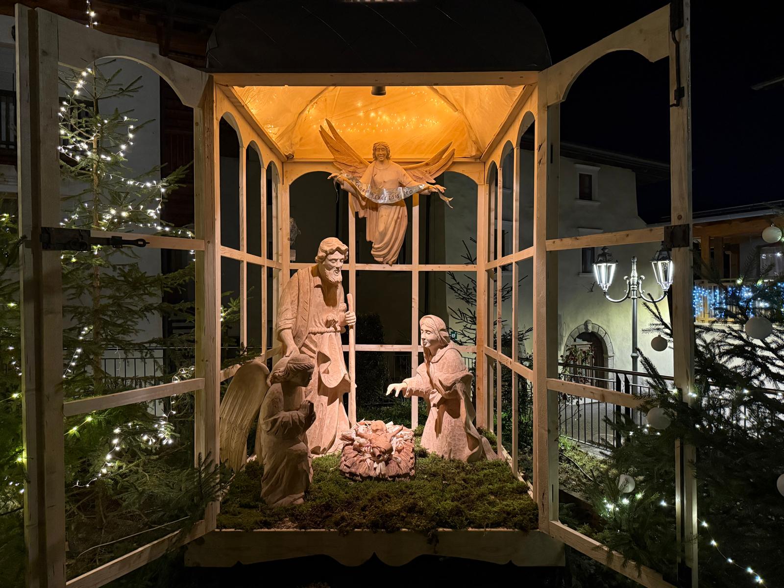 Quello di quest’anno è un altro presepe straordinario con una struttura realizzata con 1200 metri lineari di listelli in legno a sezione quadrata che creano una capanna che sembra irradiare luce. Una capanna ampia che contiene la Natività, gli angeli, la nuova statua di una pastorella e alcuni animali, un vero presepe che cresce.